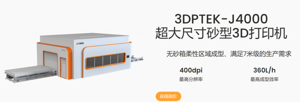 無砂箱 3D 打印機不斷實現(xiàn)技術(shù)革新,如三帝科技的 3DPTEK-J4000 采用無砂箱柔性區(qū)域成型技術(shù),可按需定制擴展打印平臺,最大能成型 4 米的砂型,滿足 10 米 + 級的生產(chǎn)需求,突破了傳統(tǒng)鑄造設(shè)備的尺寸限制,為大型復(fù)雜鑄件的制造提供了可能.