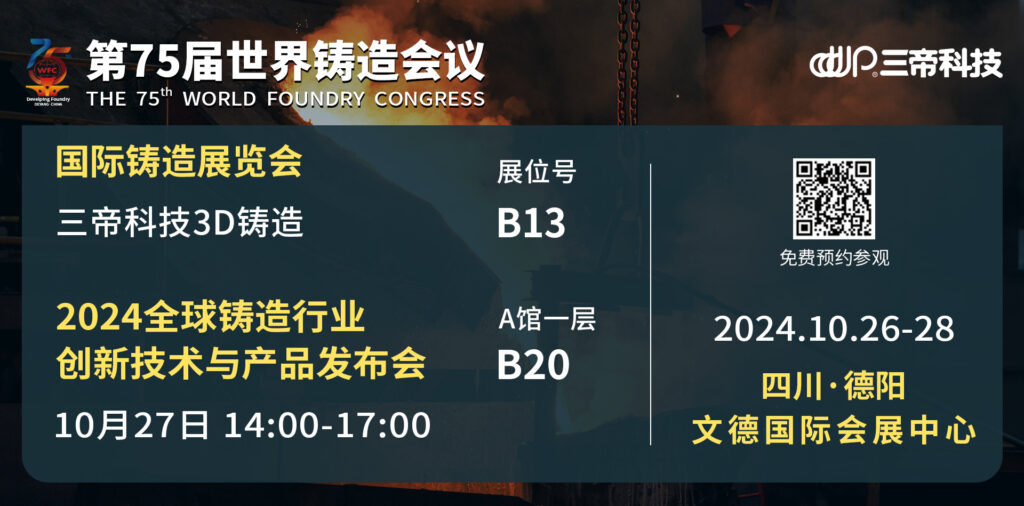 更多詳情,敬請(qǐng)關(guān)注10月26-28日將在四川省德陽市隆重舉辦的鑄造業(yè)盛會(huì)“第75屆世界鑄造會(huì)議”,三帝科技將攜3D鑄造解決方案(展位號(hào):B13)登陸展會(huì),并在27日的“2024全球鑄造行業(yè)創(chuàng)新技術(shù)與產(chǎn)品發(fā)布會(huì)”中做精彩分享。